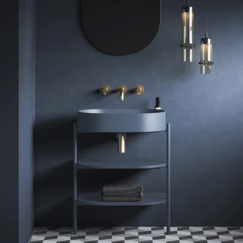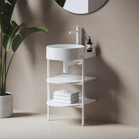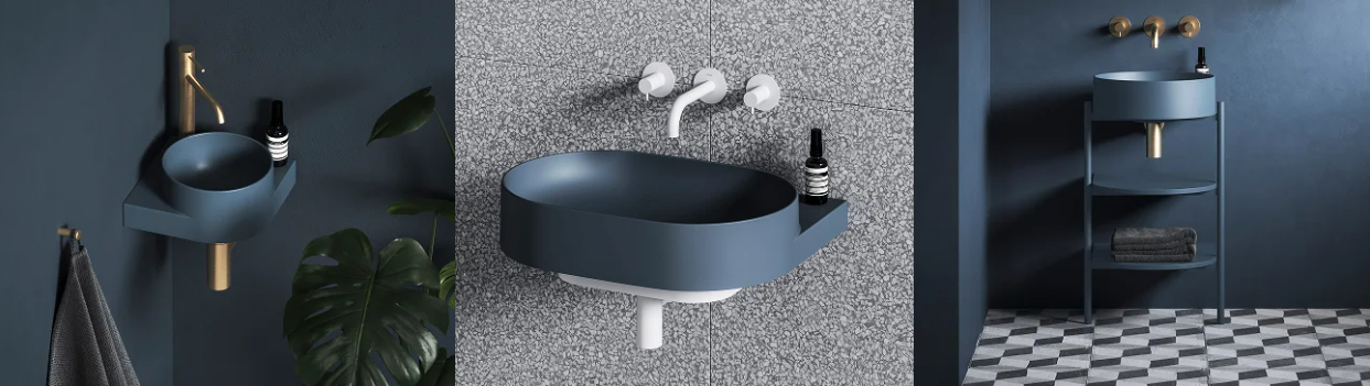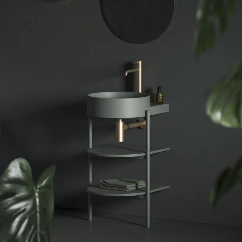 Yard-håndvaske kan monteres direkte på væggen med et stålbeslag eller kombineres med det brede udvalg af farverige åbne Yard-møbler.