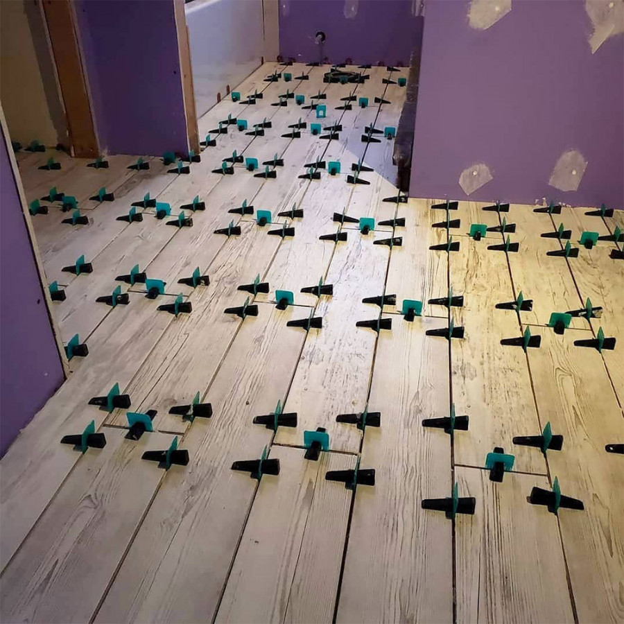 Ett Nivåsystem som du ser på bilden minskar risken att detta sker. Enkelt beskrivet är det en bygel i plast som du fäster i fogen mellan två plattor. Bygeln ska inte sitta direkt i ytterhörnen utan några centimeter in på plattan. Med en liten kil “klämmer” man sedan ner och ihop platan mot underlaget och angränsande platta. När fixet och klinkern härdat slår man enkelt av bygeln med en gummihammare eller en välriktad spark med foten.