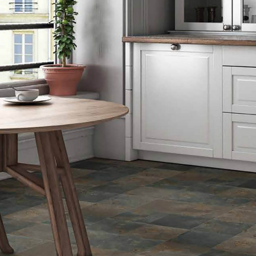 När du tittar på den stora inspirationsbilden ligger Viddelicious Legend som golvklinker i ett kök med en modern inredning med traditionella speglar på dörrar och fronter. En mörk träskiva i ger en fin kontrast ditt det unika klinkergolvet.