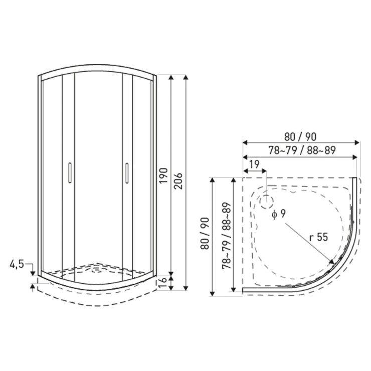 Brusehjørne med Brusebakke Sirocco 80x80 cm Rund Sort Mat