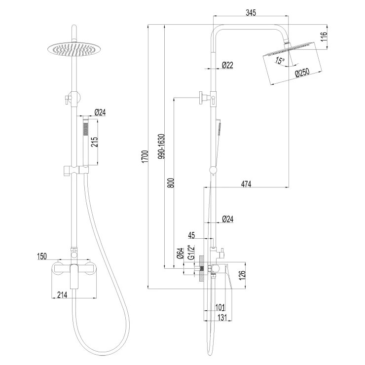 Praktisk och elegant duschkolumn med justerbar höjd från 90 till 160 cm – perfekt för både små och stora badrum.