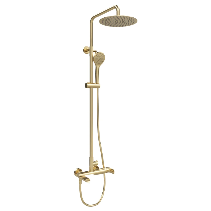 Dette brusesystem i guld giver en luksuriøs og sofistikeret følelse til ethvert badeværelse, samtidig med at det tilbyder enestående komfort. Med en teleskopisk højdejusterbar brusestang, en stor loftbruser og en håndbruser med flere funktioner får du en personlig og afslappende bruseoplevelse. Systemet er fremstillet med en høj kvalitets PVD-overfladebehandling, der garanterer lang holdbarhed, en fejlfri finish og et elegant udseende.