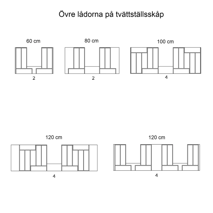 Prestigefyldte soft-close systemer fra Grass er installeret i vaskemøblerne. Den nederste skuffe har ekstra tynde glassider. De fuldt udtrækkelige skuffer gør det nemt at nå genstande – selv i de bagerste hjørner. Praktisk justering af afstand mellem fronter. Der er plads til rør bag skuffen.