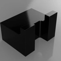 Kollektionen omfattar hyllor, handdukshållare, krokar och handtag, tvålkoppar, tvålpumpar samt hållare för toalettborste och toalettpapper. Produkterna är tillverkade i hög kvalitet och behandlade med en särskilt härdad svart lack, ofta kombinerad med detaljer i matt glas – för ett hållbart, elegant och tidlöst badrum.