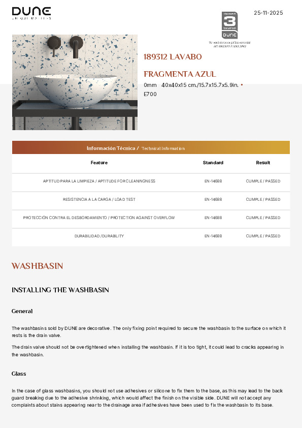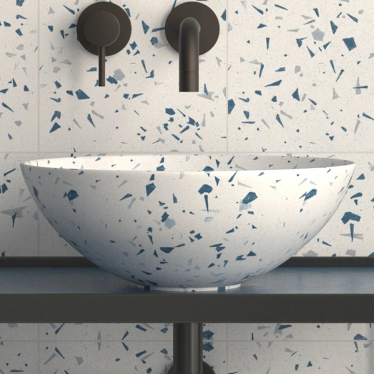 Keramiskt tvättställ med måtten 40×40×15 cm i matt finish, handmålat i blå toner med intensiva och livfulla fragment. Tvättstället är designat för att harmoniera med det konstnärliga terrazzot i serien Fragmenta och ger badrummet visuell styrka, originalitet och estetisk sammanhållning.