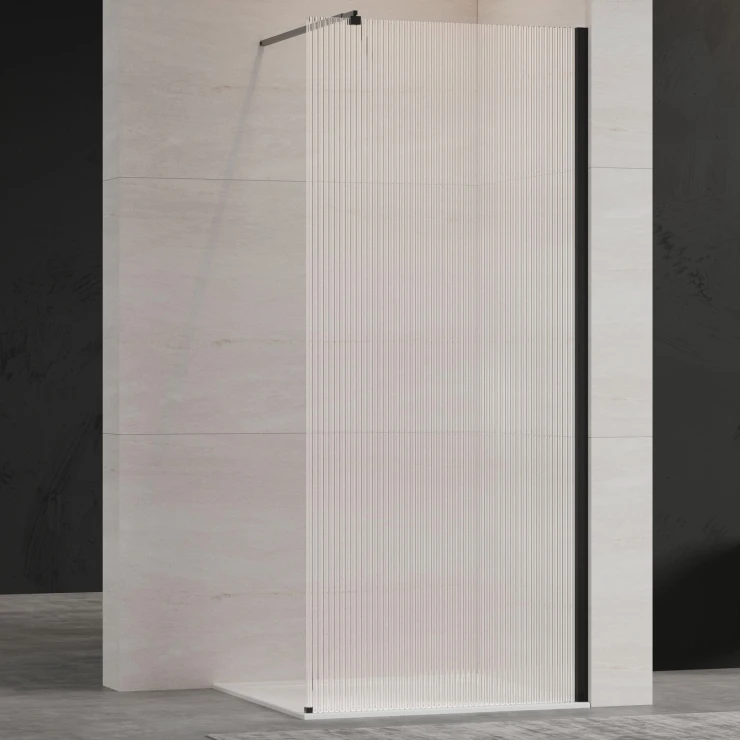 Modern walk-in duschvägg med räfflat härdat glas (8 mm) och svarta aluminiumprofiler. Den eleganta designen kombinerar stil och funktion – perfekt för både små och stora badrum. Den shiny glass-coating-behandlade ytan gör glaset vattenavvisande och lätt att rengöra, vilket minskar kalk- och smutsavlagringar. Ett exklusivt val för dig som vill skapa en öppen, minimalistisk och trendig duschlösning.