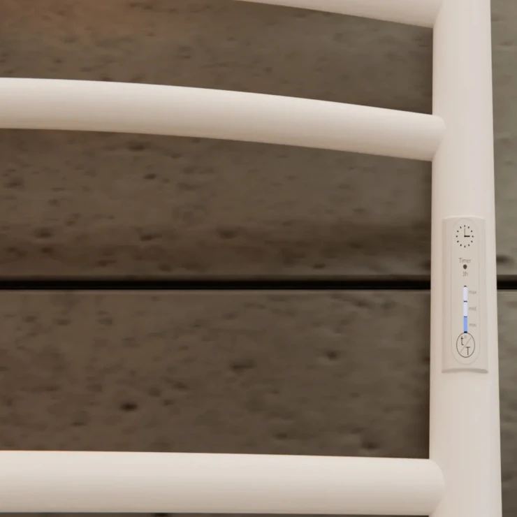 Den elektriske håndklædetørrer er udstyret med en temperaturregulator med tre varmetilstande samt en indbygget timerfunktion. I TIMER 3H-tilstand slukker enheden automatisk efter tre timer, hvilket giver øget sikkerhed og energieffektivitet. Dette energieffektive badeværelsesprodukt forbruger meget lidt strøm og kan reducere det månedlige energiforbrug med op til 70 %.