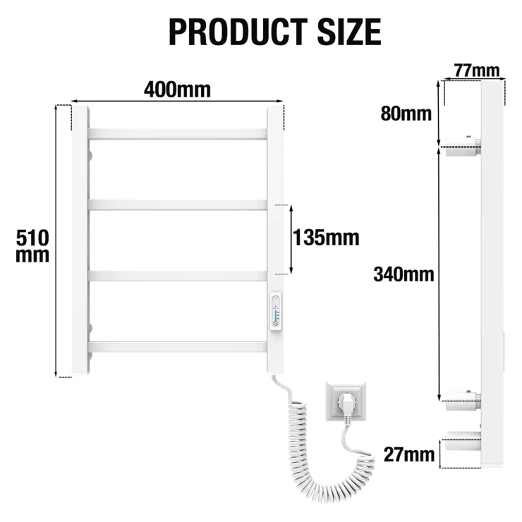 Denne elektriske håndklædetørrer er designet til høj komfort og nem anvendelse. Den kan tilsluttes hvor som helst, der er adgang til strøm. Takket være et tørt internt varmesystem kræves ingen væsker – det er bare at tilslutte og begynde at bruge. Håndklædetørreren varmes hurtigt op og når sin maksimale temperatur inden for få minutter.