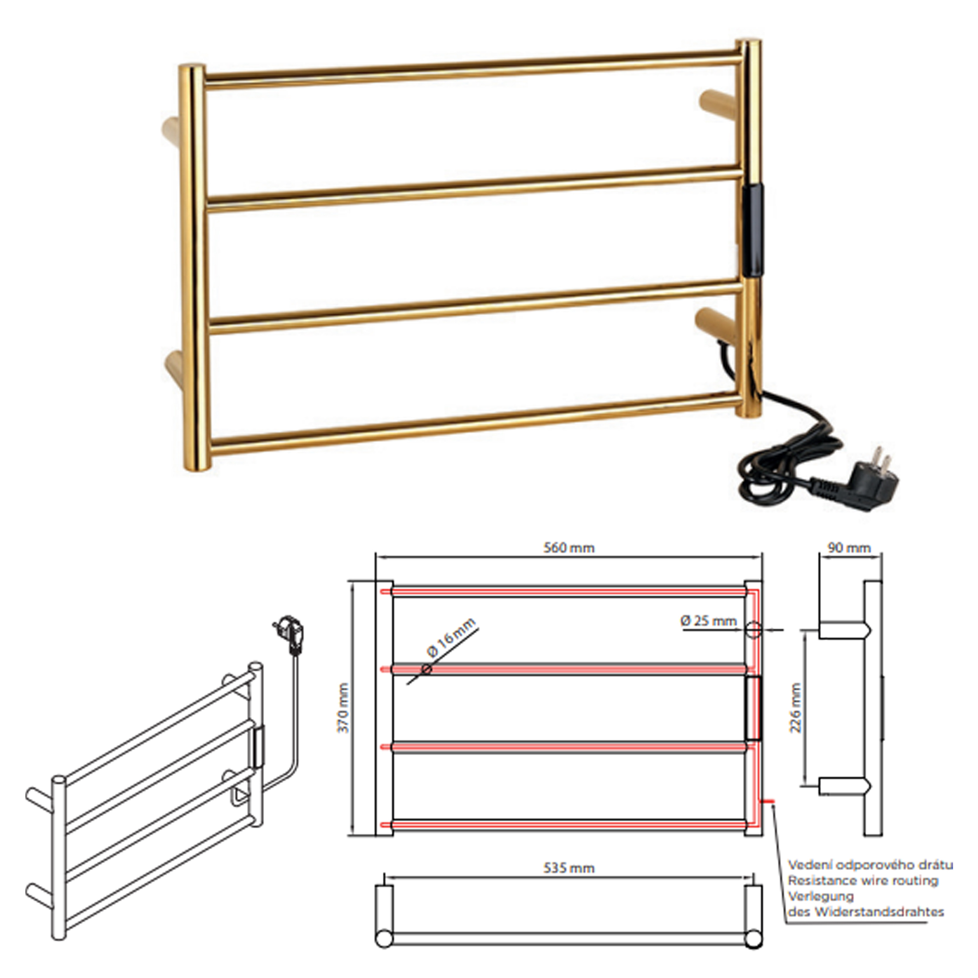 Fast anslutning till väggens elinstallation: med hjälp av en adapter är fast anslutning möjlig. Adaptern ingår inte och måste köpas separat. Adaptern finns tillgänglig i samma färger som de elektriska handdukstorkarna.