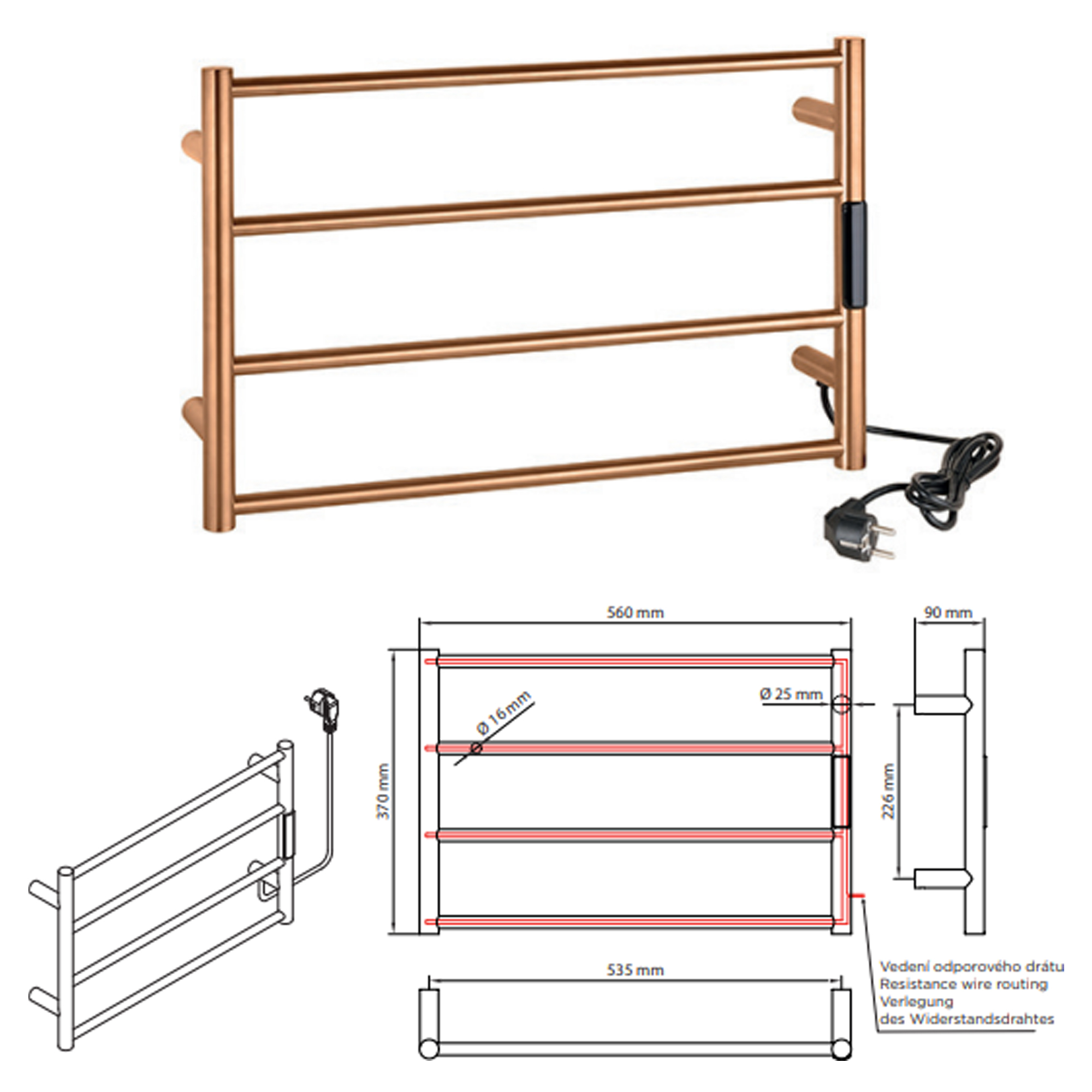För mindre utrymmen är våra kompakta uppvärmda handdukstorkar i storleken 560 × 90 × 370 mm ett perfekt val. De finns i flera färger samt i både blank och matt finish. Dessa designade handdukstorkar torkar dina handdukar effektivt och tillför samtidigt ett modernt uttryck till badrummet. De kan antingen anslutas direkt till ett eluttag eller integreras diskret i väggen med hjälp av en adapter, vilket ger en flexibel och stilren installation.