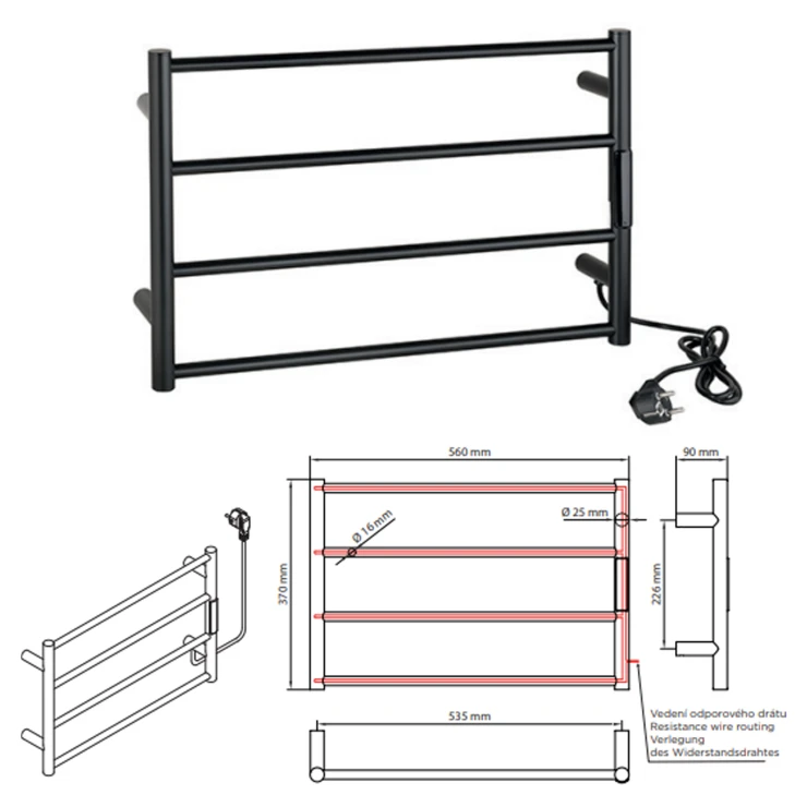 För mindre utrymmen är våra kompakta uppvärmda handdukstorkar i storleken 560 × 90 × 370 mm ett perfekt val. De finns i flera färger samt i både blank och matt finish. Dessa designade handdukstorkar torkar dina handdukar effektivt och tillför samtidigt ett modernt uttryck till badrummet. De kan antingen anslutas direkt till ett eluttag eller integreras diskret i väggen med hjälp av en adapter, vilket ger en flexibel och stilren installation.