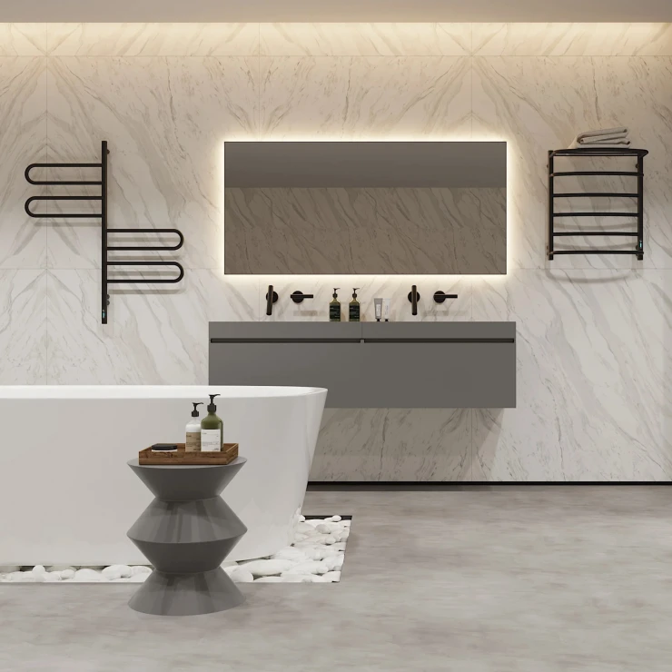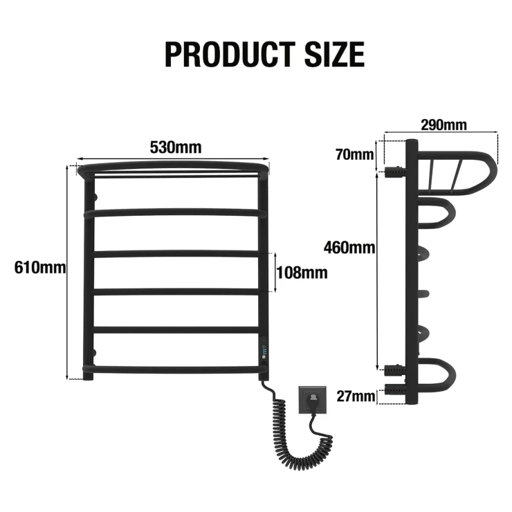 I tråd med globale trends inden for badeværelsesdesign præsenterer vi denne elektriske håndklædetørrer i mat sort udførelse. Et perfekt designvalg for kunder, der værdsætter industrielle farvetoner, minimalistisk æstetik og rene metalformer.