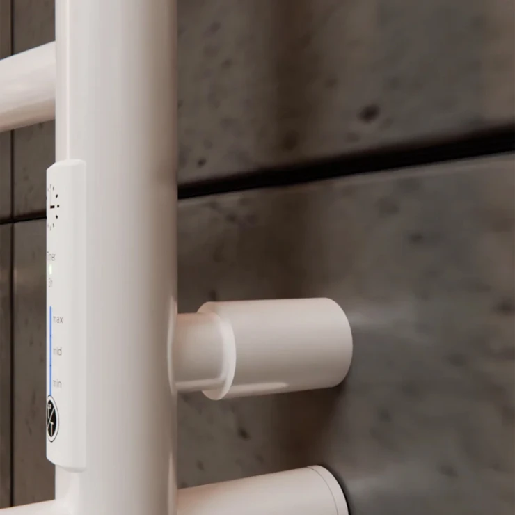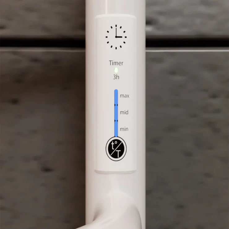 Den elektriske håndklædetørrer er udstyret med en temperaturregulator med tre varmetilstande samt en indbygget timerfunktion. I TIMER 3H-tilstand slukker enheden automatisk efter tre timer, hvilket giver øget sikkerhed og energieffektivitet. Dette energieffektive badeværelsesprodukt forbruger meget lidt strøm og kan reducere det månedlige energiforbrug med op til 70 %.
