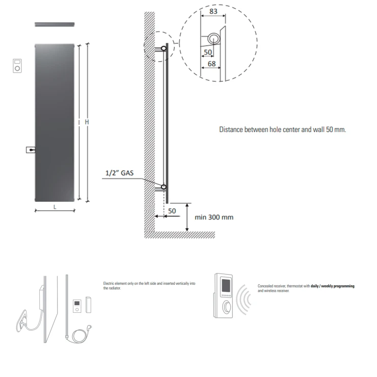 • Elpatron endast på vänster sida, monterad vertikalt inuti radiatorn