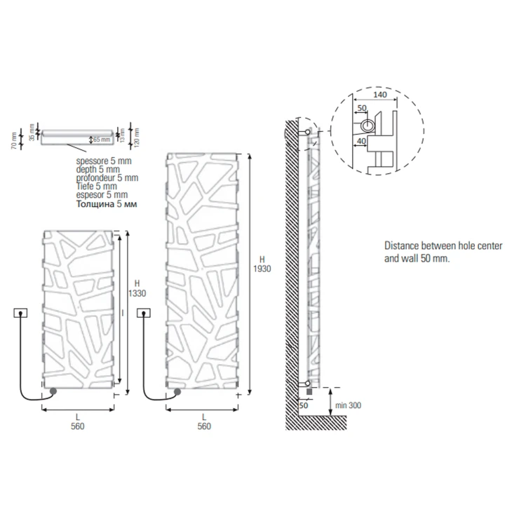 • Avstånd mellan hålcentrum och vägg: 50 mm