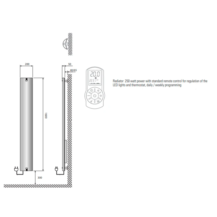 Radiator med 250 W effekt, utrustad med standard-fjärrkontroll för styrning av både LED-belysning och termostat. Inkluderar daglig och veckovis programmering för maximal komfort och energieffektivitet.