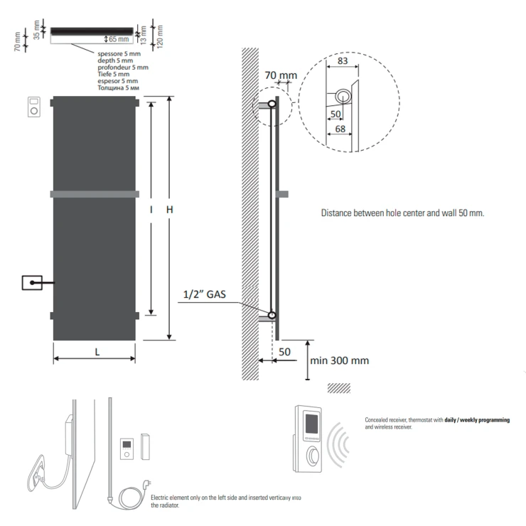 • Endast elpatron på vänster sida, monterad vertikalt inuti radiatorn.