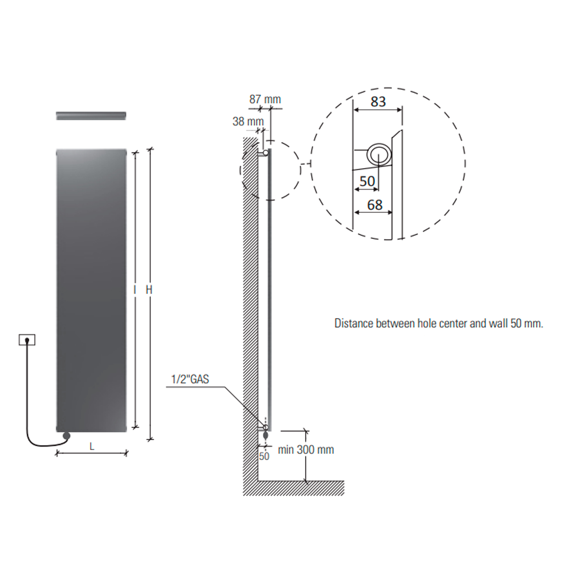 • Avstånd mellan hålcentrum och vägg: 50 mm