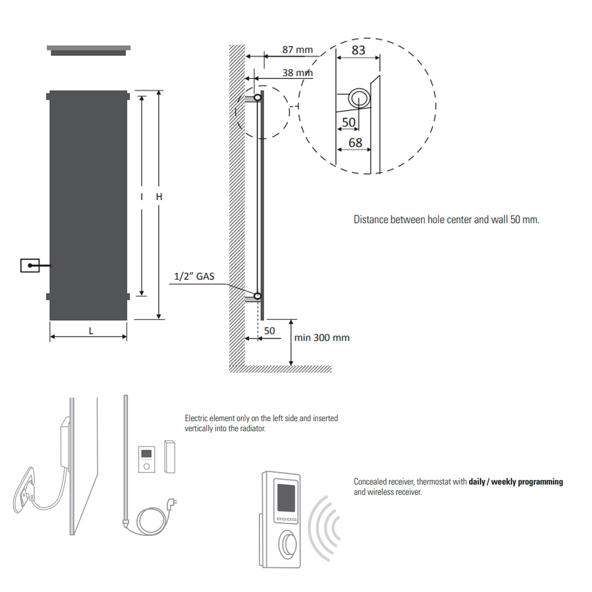 • Endast elpatron på vänster sida, monterad vertikalt inuti radiatorn.