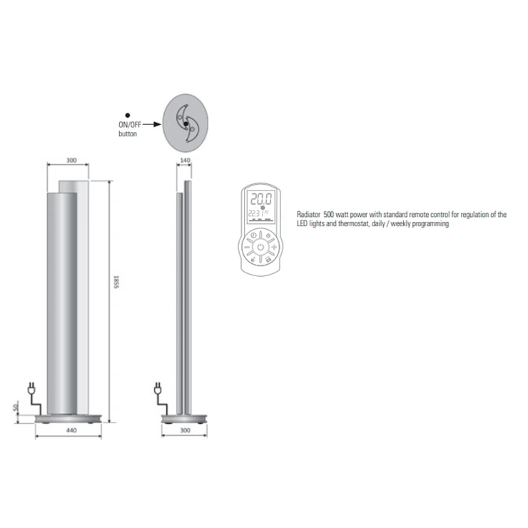 Radiator med 500 W effekt, utrustad med standard-fjärrkontroll för styrning av både LED-belysning och termostat. Inkluderar daglig och veckovis programmering för maximal komfort och energieffektivitet.