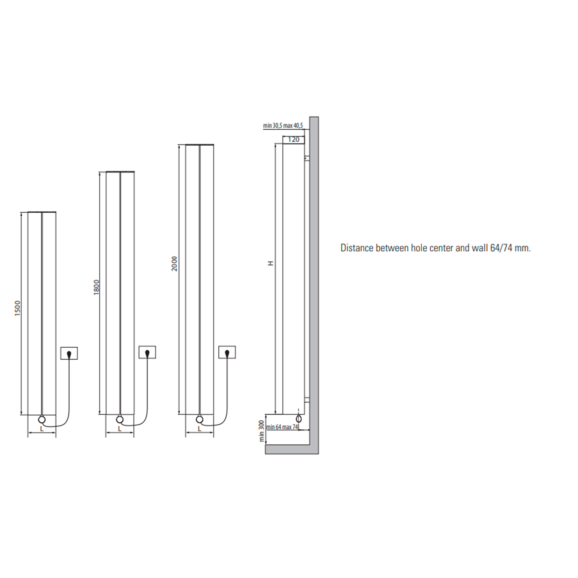 • Avstånd mellan hålcentrum och vägg: 64 / 74 mm