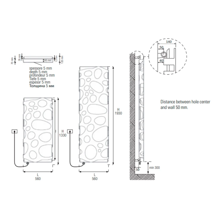 • Avstånd mellan hålcentrum och vägg: 50 mm