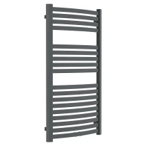 Modern bad­rums­radiator i stål med universella anslutningar: botten mitt (D50 – 50 mm) och botten axiell (500 mm).