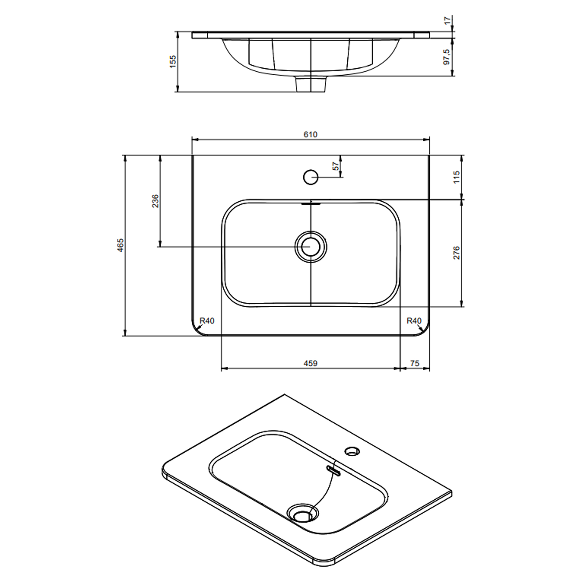 Findes i flere størrelser – 60, 80, 100 og 120 cm – samt i forskellige udførelser, hvilket gør, at modellen nemt kan tilpasses forskellige planløsninger. Den tilbydes i en 120 cm-version med en vaskeskål og et blandingshul, samt i en 120 cm-version med en vaskeskål og to blandingshuller, hvilket giver løsninger både til enkelt og delt brug.