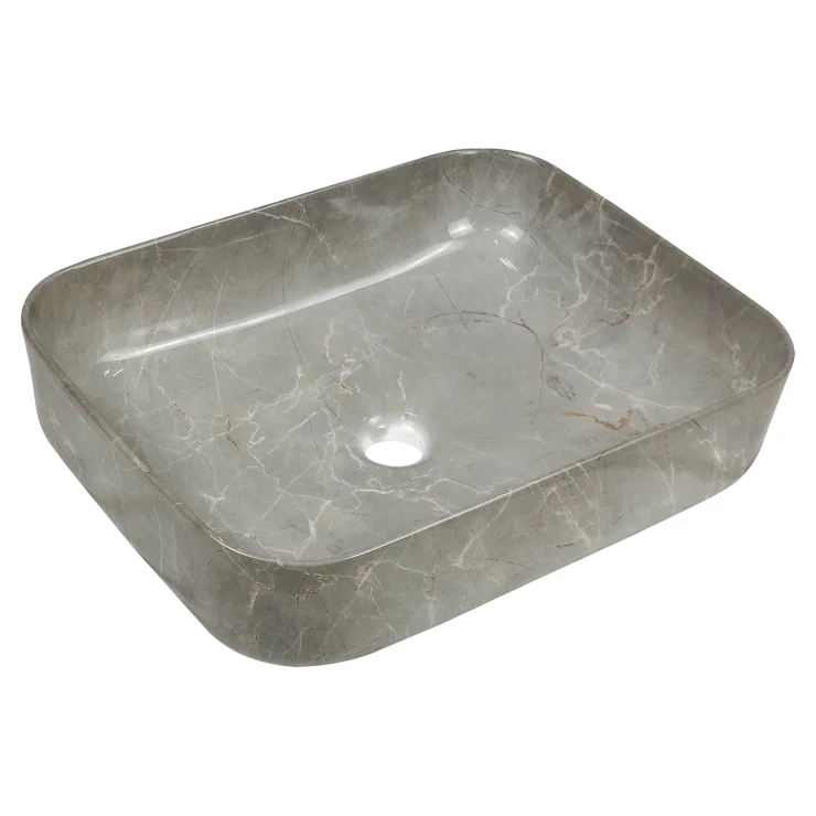 Elegant rektangulärt tvättställ i keramik med naturlig marmoreffekt som ger badrummet en tidlös och lyxig känsla. Det 11 cm djupa tvättstället erbjuder bekväm användning och en modern design som passar de flesta bänkskivor. Lätt att rengöra och perfekt att kombinera med hög blandare.