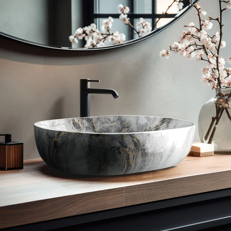 Oavsett om du föredrar rund, oval eller rektangulär form, erbjuder dessa tvättställ en sofistikerad balans mellan modern skandinavisk estetik och naturlig steninspiration. Matcha gärna med hög blandare i svart, krom eller mässing för ett komplett och stilrent uttryck.