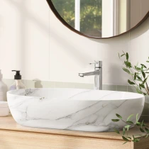 Elegant ovalt tvättställ i keramik med marmoreffekt i vitt. Det 12 cm djupa tvättstället kombinerar modern design med tidlös estetik. Den glatta ytan är enkel att rengöra och framhäver de mjuka stenliknande nyanserna. Perfekt för både moderna och klassiska badrum, och passar utmärkt med hög blandare.