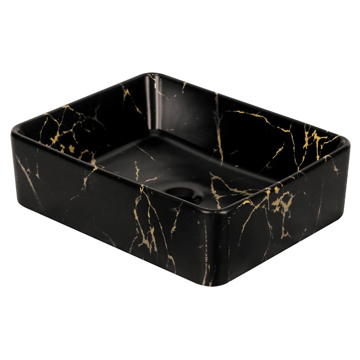 Exklusivt tvättställ i sanitetskeramik med halvblank svart finish och eleganta gulddetaljer. Perfekt för ett modernt och lyxigt badrum.