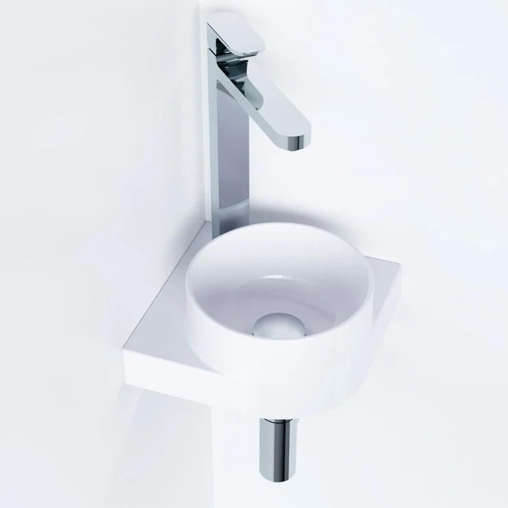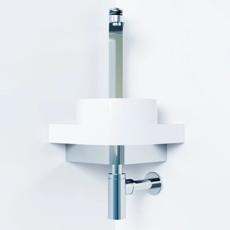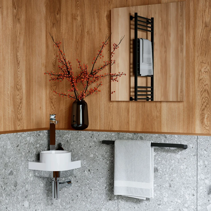 • -Stabilt stöd, inga möbler behövs: Yard installeras direkt på väggen med en stålkonsol, vilket eliminerar behovet av ytterligare möbler. Konsolen matchar tvättställets form och förbättrar helhetsintrycket.