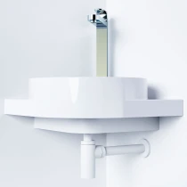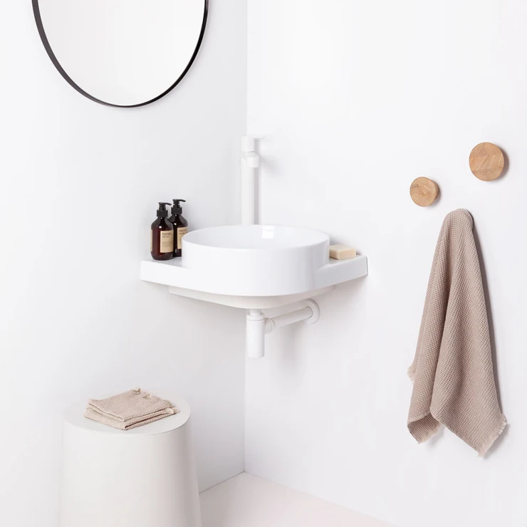 • -Stabilt stöd, inga möbler behövs: Yard installeras direkt på väggen med en stålkonsol, vilket eliminerar behovet av ytterligare möbler. Konsolen matchar tvättställets form och förbättrar helhetsintrycket.