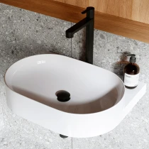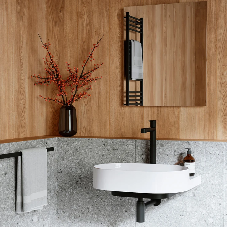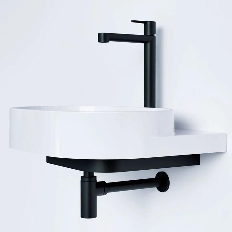 • -Stabilt stöd, inga möbler behövs: Yard installeras direkt på väggen med en stålkonsol, vilket eliminerar behovet av ytterligare möbler. Konsolen matchar tvättställets form och förbättrar helhetsintrycket.