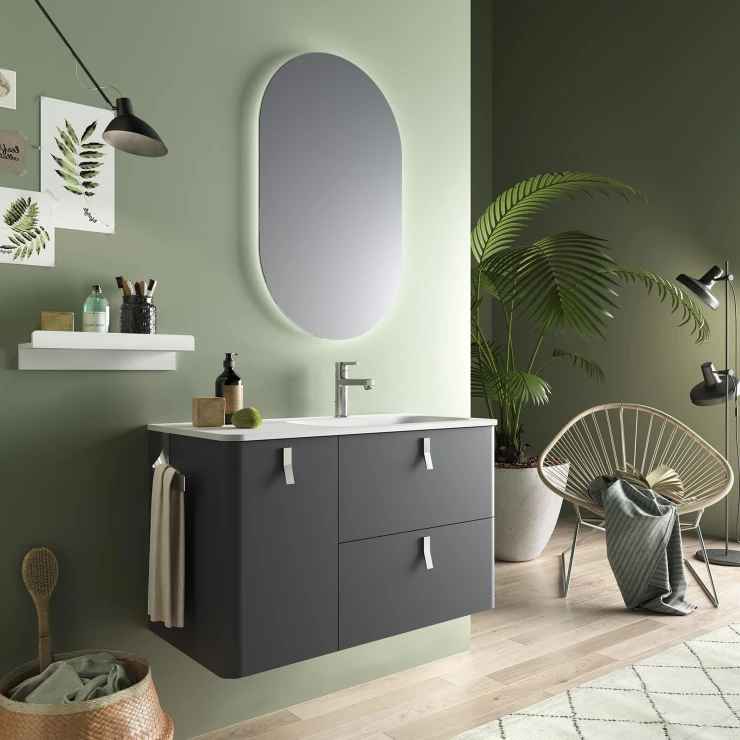 Kollektionen finns i tre varianter av tvättställsskåp: 60 cm med två lådor, 90 cm med dörr till höger samt 90 cm med dörr till vänster.