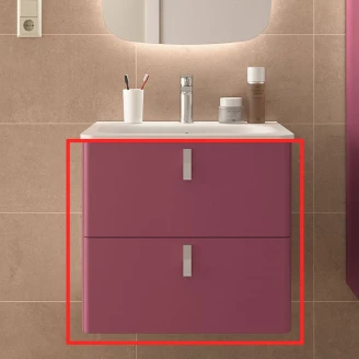 Kollektionen finns i tre varianter av tvättställsskåp: 60 cm med två lådor, 90 cm med dörr till höger samt 90 cm med dörr till vänster.
