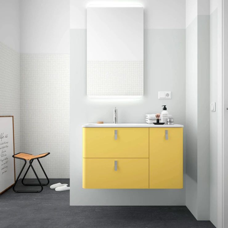 Kollektionen finns i tre varianter av tvättställsskåp: 60 cm med två lådor, 90 cm med dörr till höger samt 90 cm med dörr till vänster.