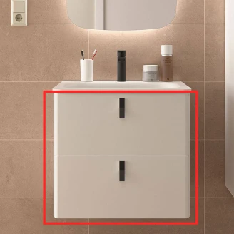 Kollektionen finns i tre varianter av tvättställsskåp: 60 cm med två lådor, 90 cm med dörr till höger samt 90 cm med dörr till vänster.