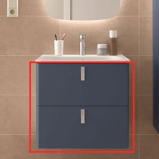 Kollektionen finns i tre varianter av tvättställsskåp: 60 cm med två lådor, 90 cm med dörr till höger samt 90 cm med dörr till vänster.