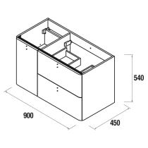 Kollektionen finns i tre varianter av tvättställsskåp: 60 cm med två lådor, 90 cm med dörr till höger samt 90 cm med dörr till vänster.