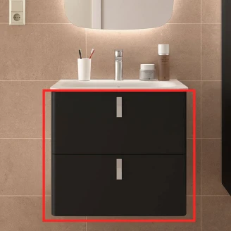 Kollektionen finns i tre varianter av tvättställsskåp: 60 cm med två lådor, 90 cm med dörr till höger samt 90 cm med dörr till vänster.