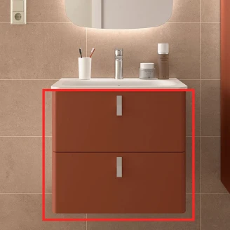 Kollektionen finns i tre varianter av tvättställsskåp: 60 cm med två lådor, 90 cm med dörr till höger samt 90 cm med dörr till vänster.
