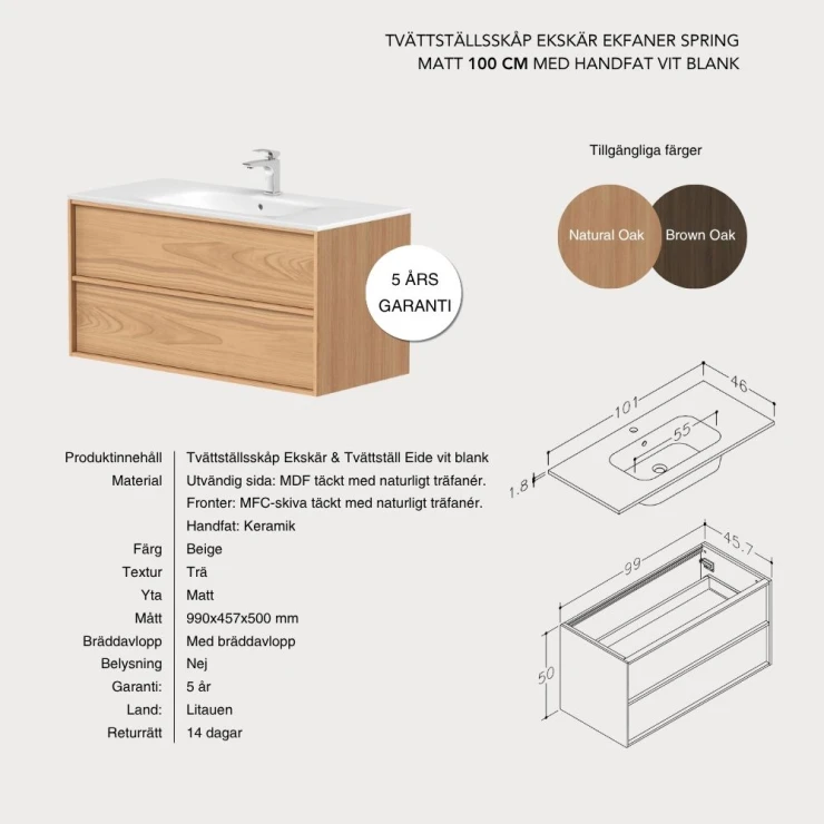 Materiale: Utvändig sida, MDF täckt med naturligt träfanér. Fronter, MFC-skiva täckt med naturligt träfanér. Handfat, Keramik