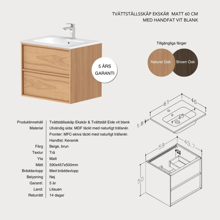 Materiale: Utvändig sida, MDF täckt med naturligt träfanér. Fronter, MFC-skiva täckt med naturligt träfanér. Handfat, Keramik