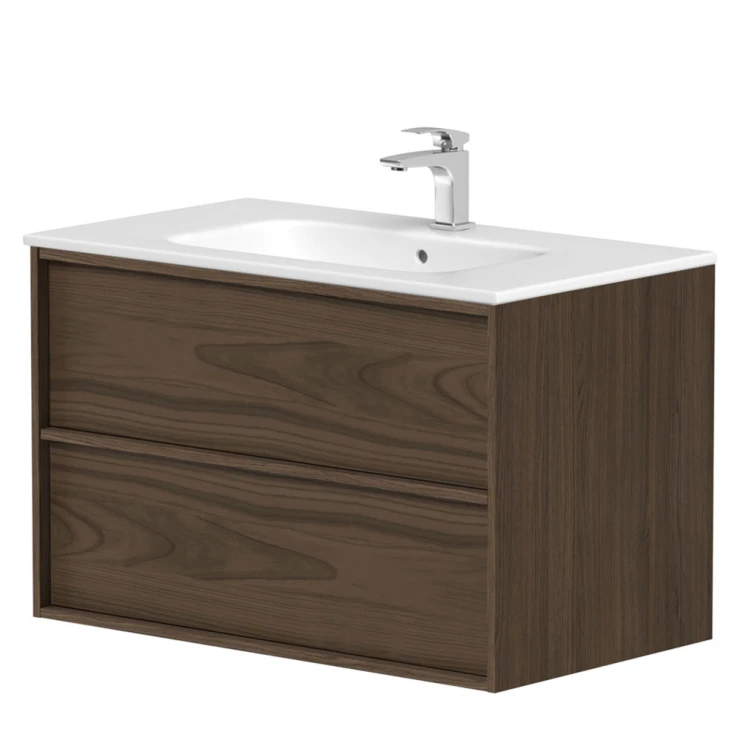 Njut av de integrerade ergonomiska handtagen av naturlig ek och gott om förvaring för dina saker i den rymliga handfatsenhetens lådor.