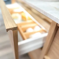 Nyd de integrerede ergonomiske greb i naturlig eg og den rummelige opbevaring til dine ting i skuffeelementets rummelige låger.