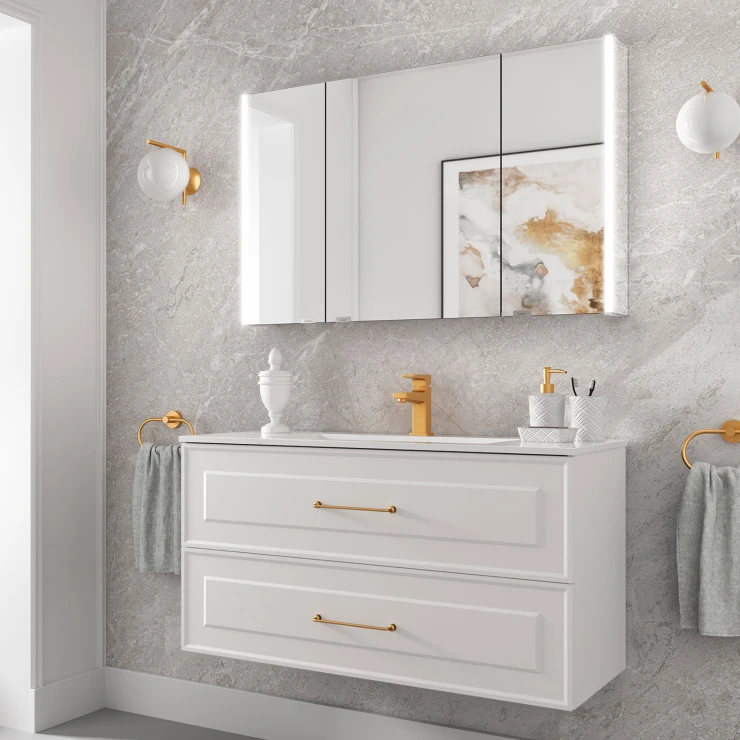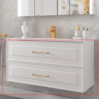 Tvättställsskåp Norrby Vit Matt 100 cm med Handfat Vit Blank & Handtagen Lineya Guld