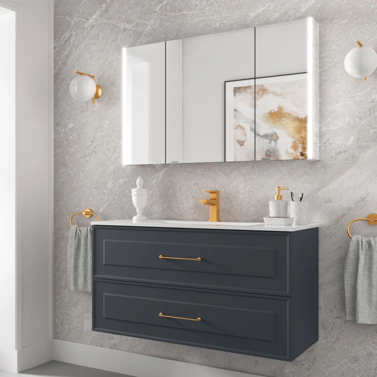 Tvättställsskåp Norrby Mörkblå Matt 100 cm med Handfat Vit Blank & Handtagen Lineya Guld