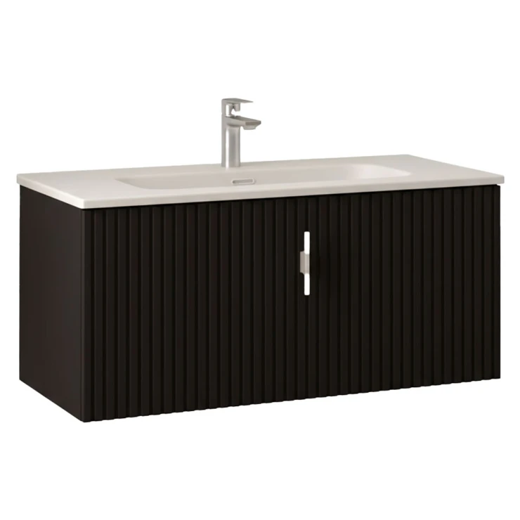 • Runa-serien är skapad för dig som vill ge ditt badrum personlighet och djup. Med sina vertikala spårfrästa fronter skapas en harmonisk rytm och känsla av rörelse som gör möbeln levande och unik.